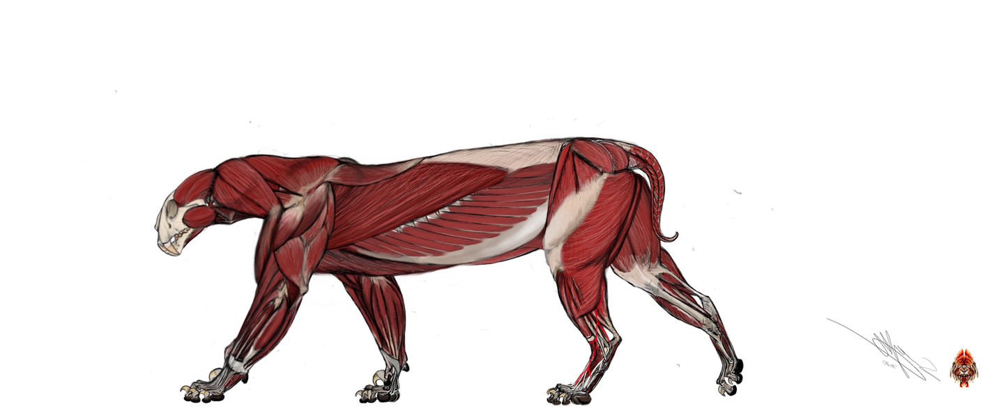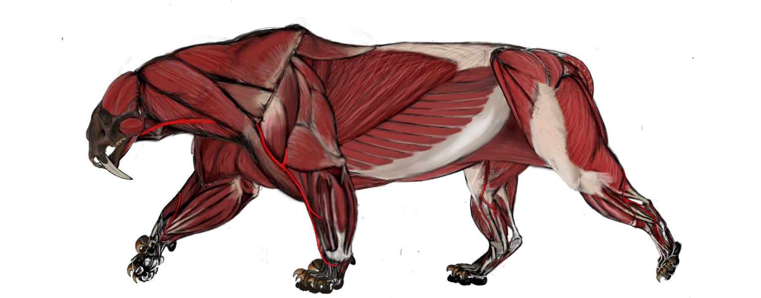 Though about the size of a modern lion, Smilodon was built differently, heavier and much more robust than any big cat today. Thick, stout forearms and shoulders, a long and muscular neck, flexible hands with large claws made Smilodon a very potent stalker, grappler and subdued of large prey.